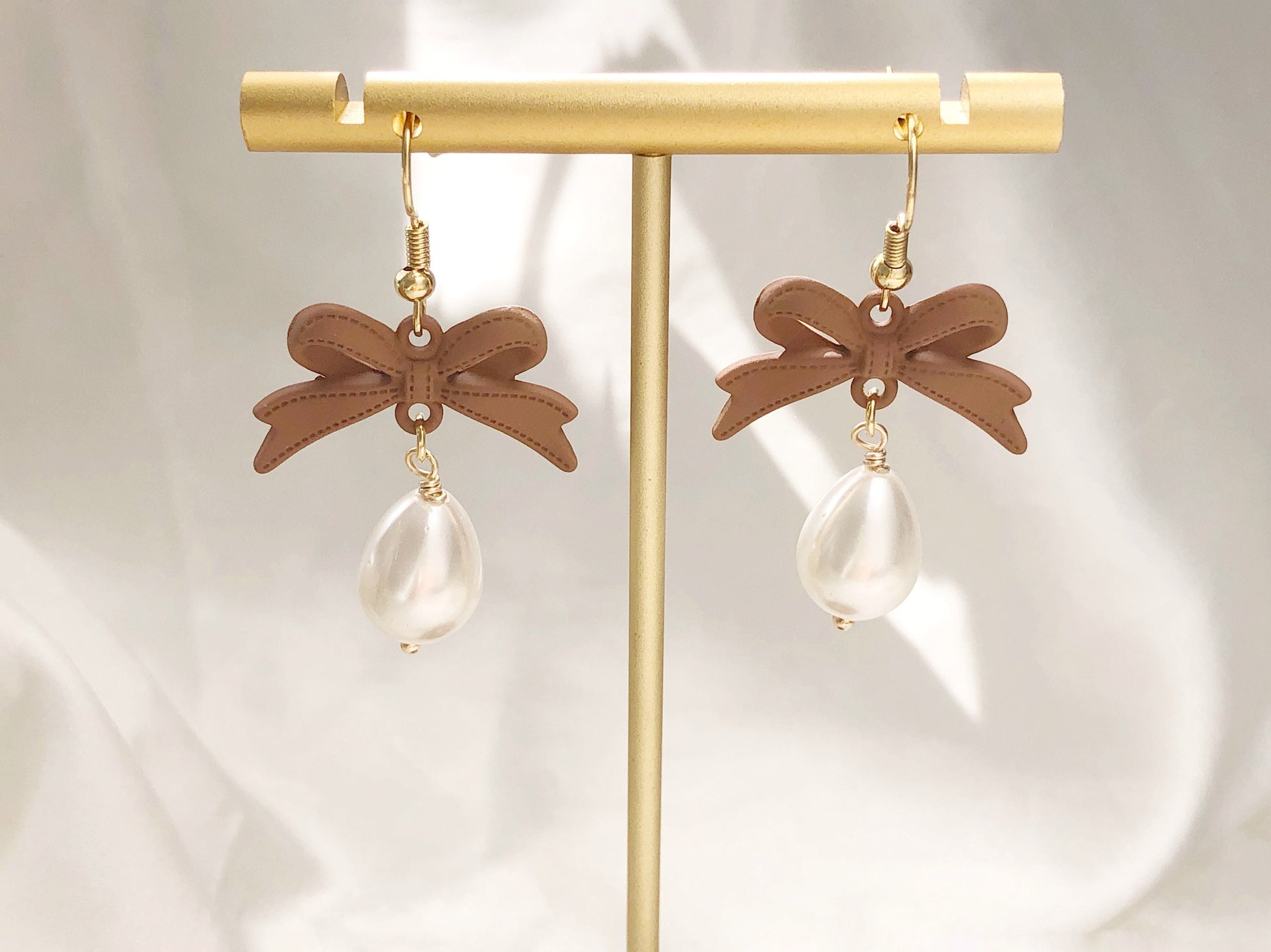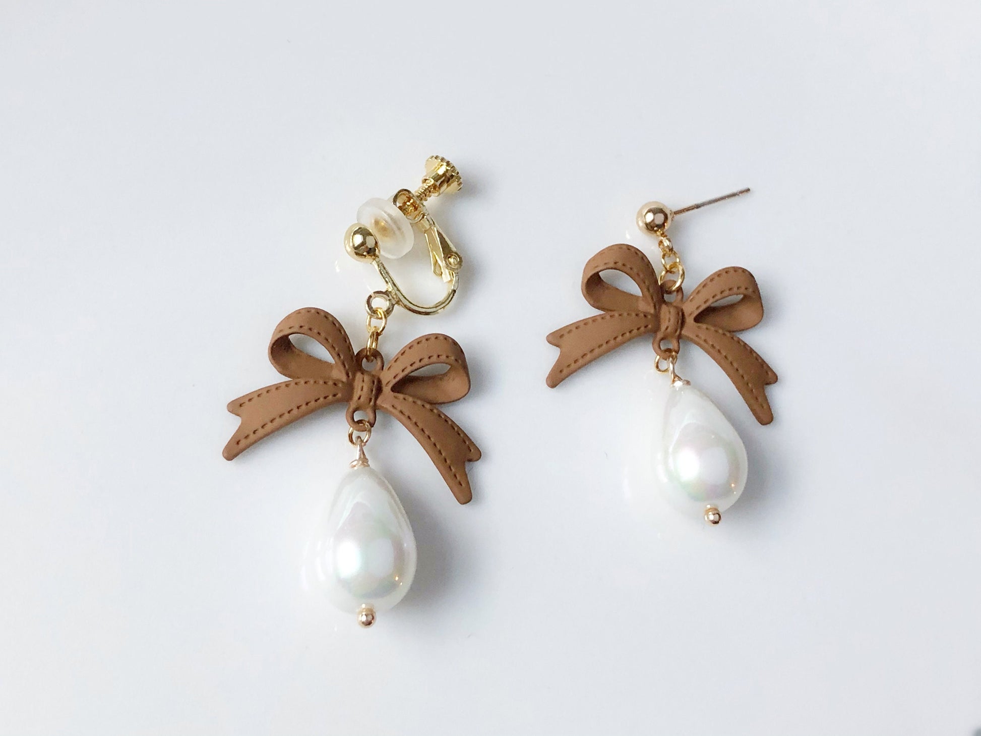 Brown bowknot and Faux teardrop Pearl stud / clip on Earrings, Gift for her