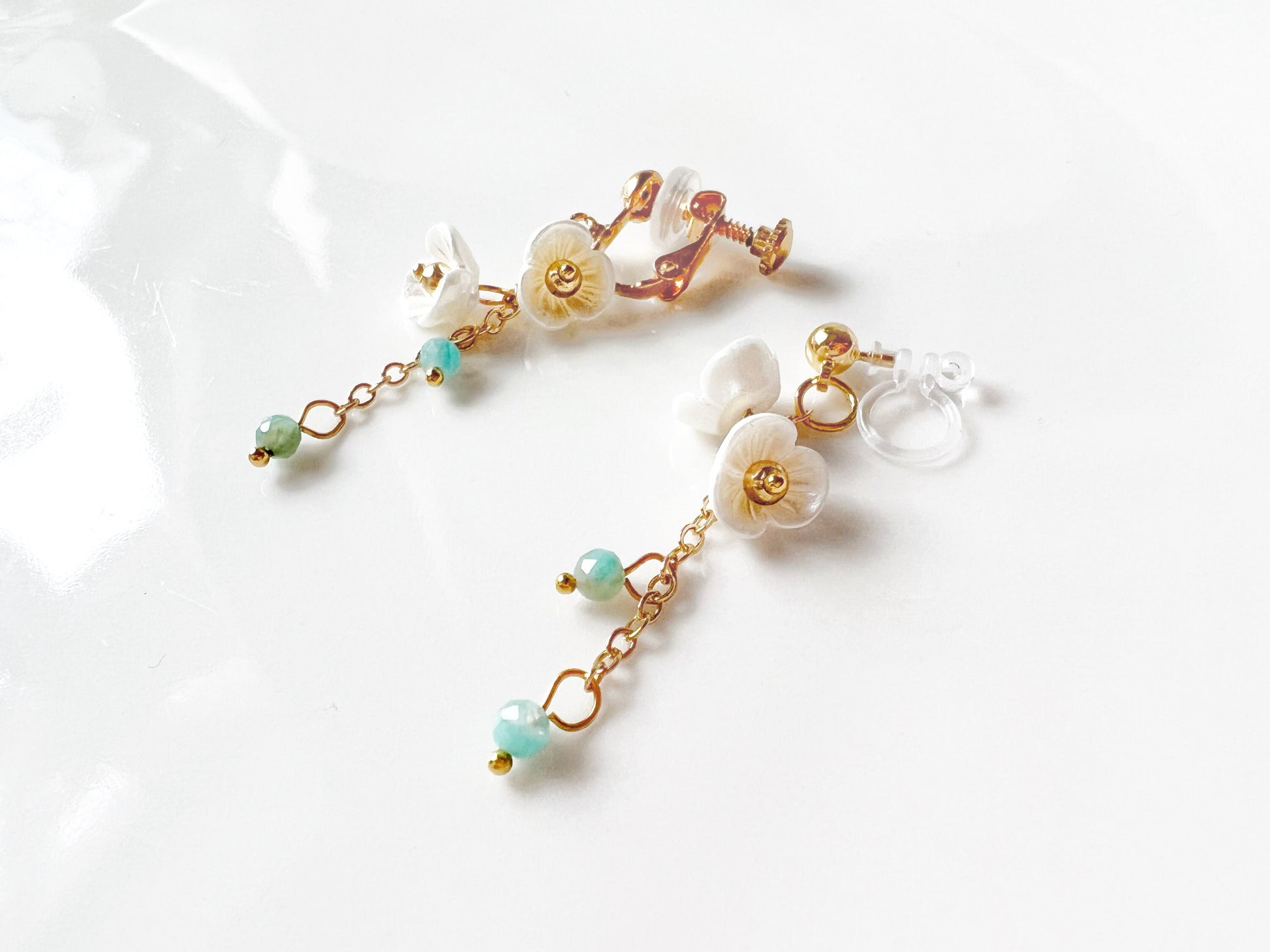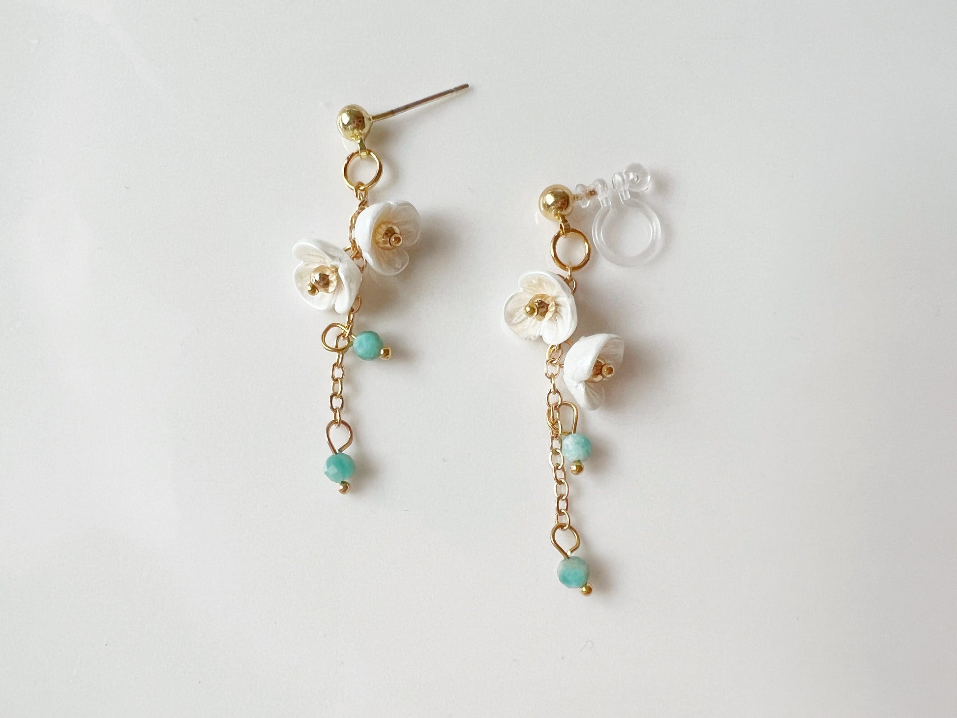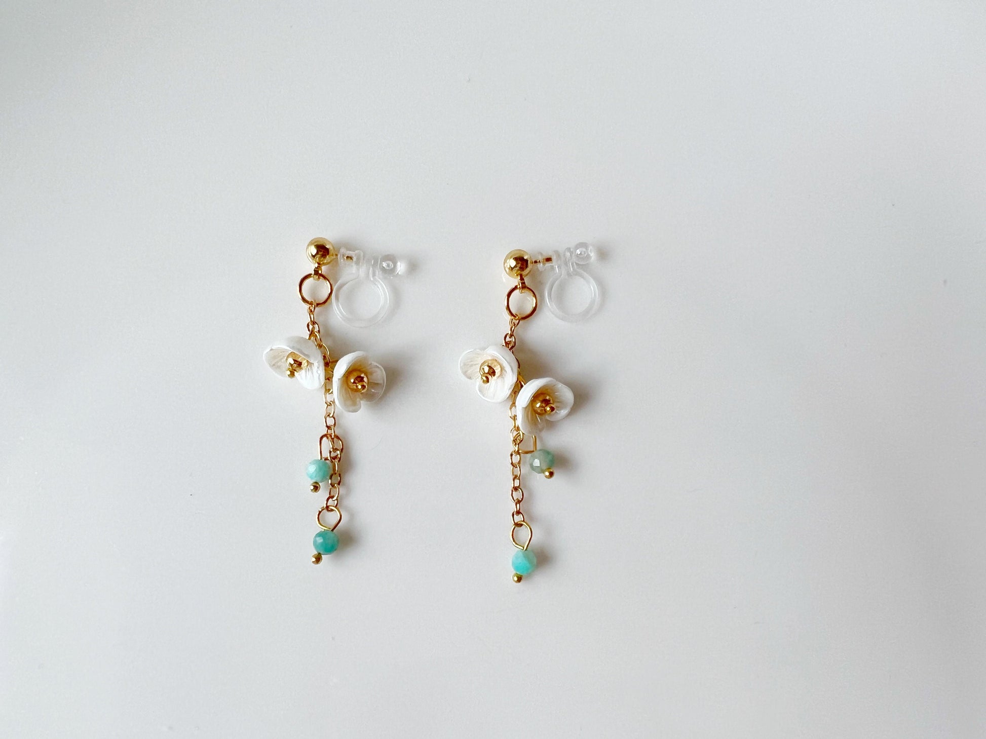 Cute White Flower and Green bead earrings, Dainty Floral Clip on earring, Gift for her