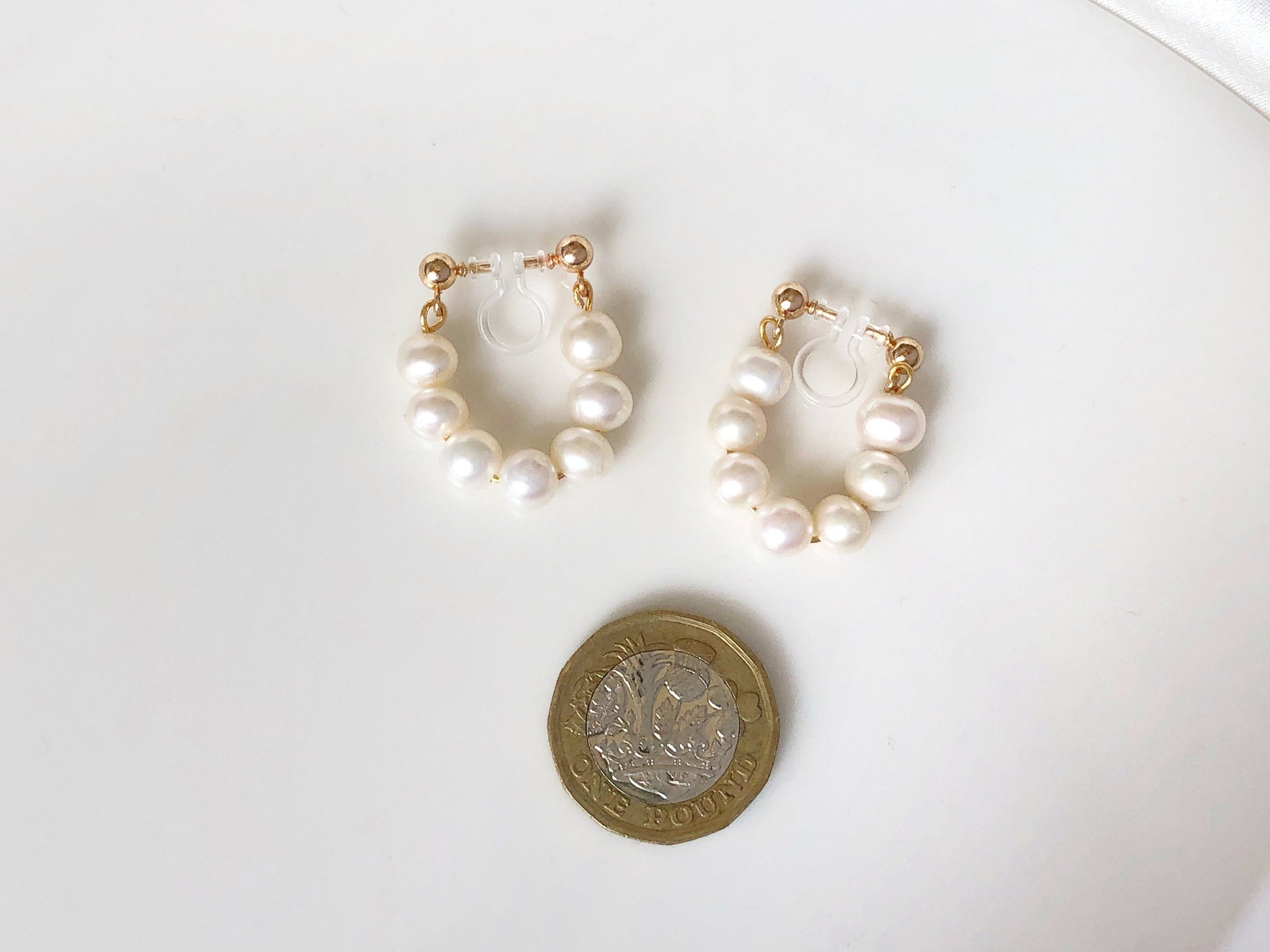 Dangle white wreath freshwater pearl drop Clip on Earrings, Gift for her