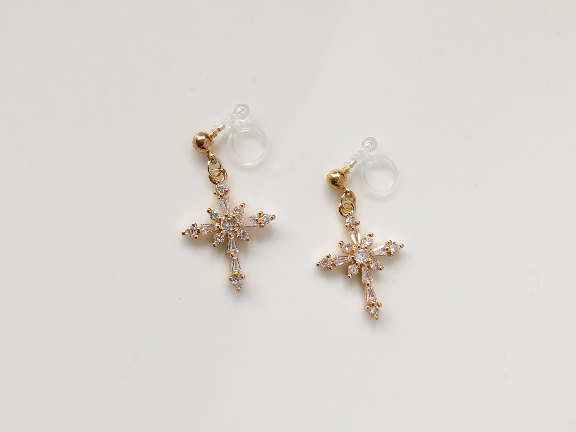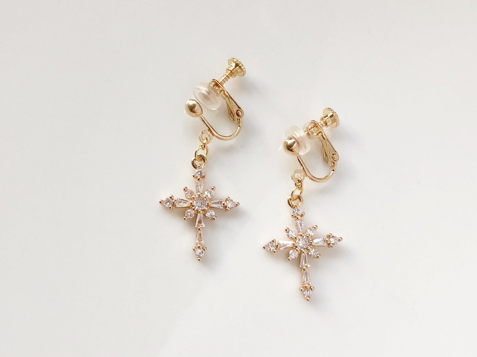 Gold colour Dangle Cross Hook/ clip on Christmas Earrings, Dainty Xmas cross earrings