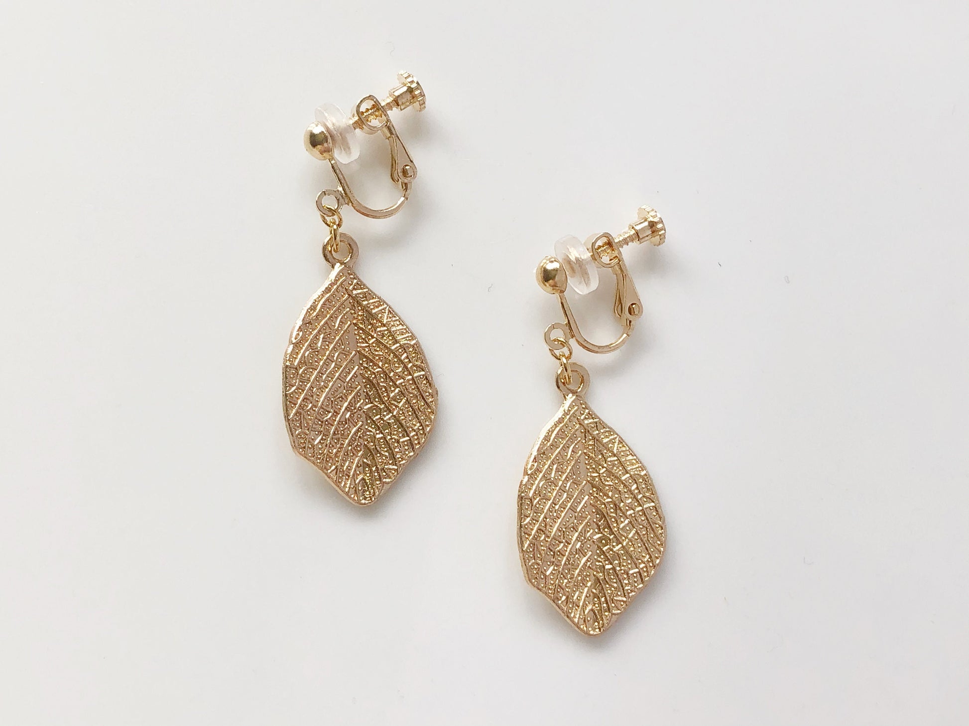 Gold colour leaves clip on/ stud Earrings, Gold plated Dainty dangle pendant, Gift for her