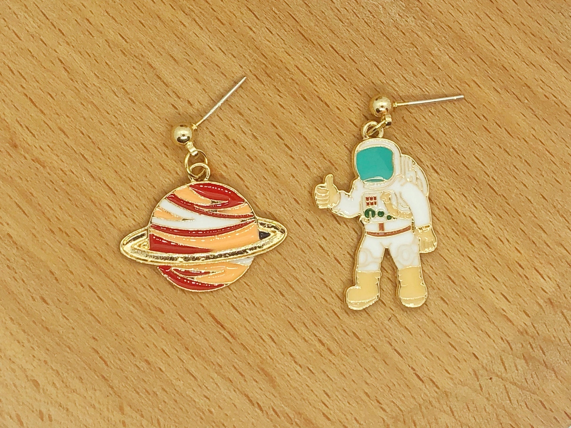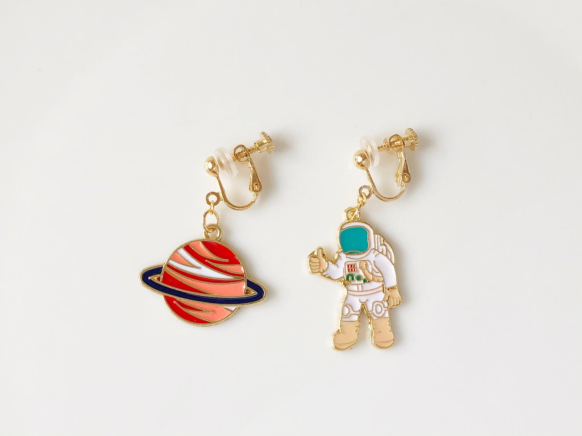 Mismatch Planet and astronaut clip on/stud Earrings, Asymmetrical Saturn Planet and Space Jewellery, gift for her