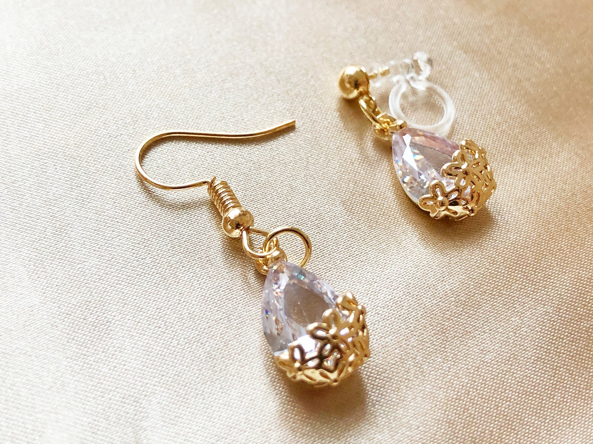 Teardrop Clip On or Stud Earrings | Gold Dangle Jewellery | Elegant Retro Gift for Her | Bridesmaid or Wedding Jewelry